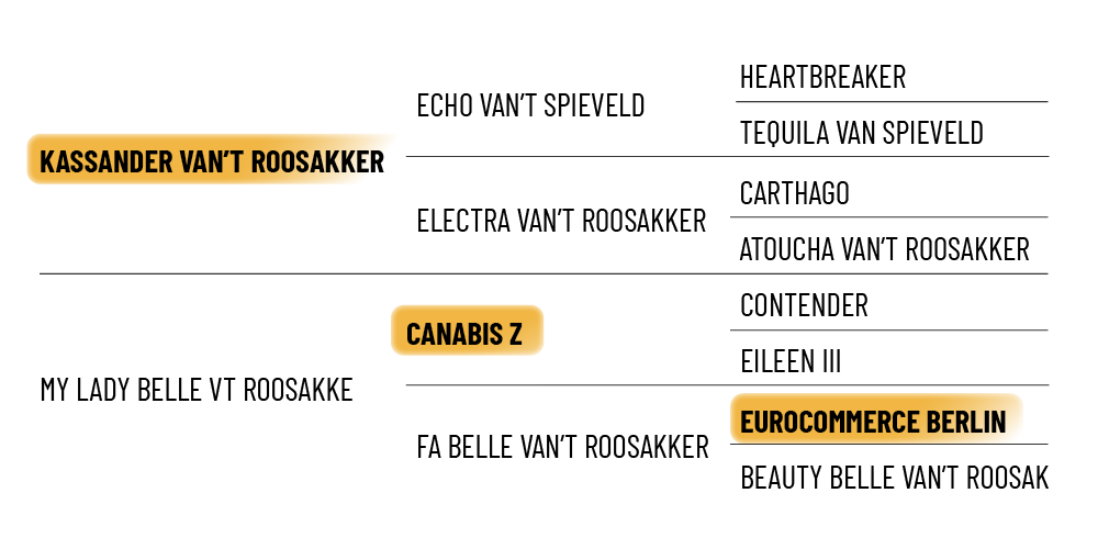 La 3ème mère de Kassander van’t Roosakker est la mythique Usha van’t Roosakker. De sa très prolifique souche sont sortis plus de 110 black type, dont près de 40 ont performé sur 1,60 dont Cella, grande gagnante sous la selle de Ben Maher, Erco van’t Roosakker sous la selle de Lorenzo de Lucca, Luigi vd Bisschop avec Matt Archer, Emperio van’t Roosakker avec Zuzanna Gowin, Equador van’t Roosakker avec Frédéric David, …
